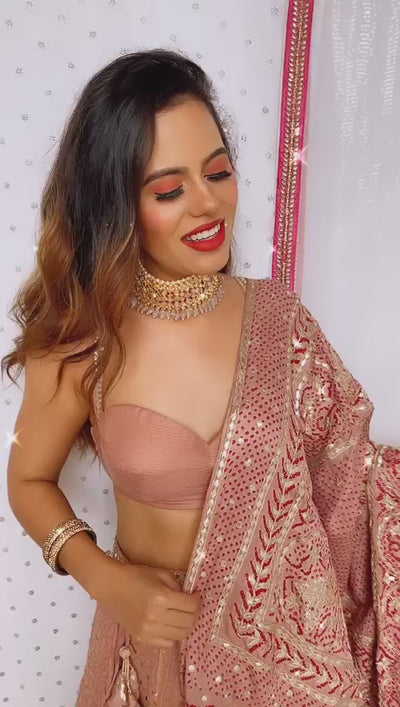 A dreamy blush pink chikankari lehenga , paired with a contemporary bustier blouse for a chic and modern silhouette. The look is elevated with a rich bandhni dupatta featuring intricate gold and red dots detailing, adding a stunning traditional contrast. Perfect for sangeets, receptions, and festive soirées where glamour meets heritage.