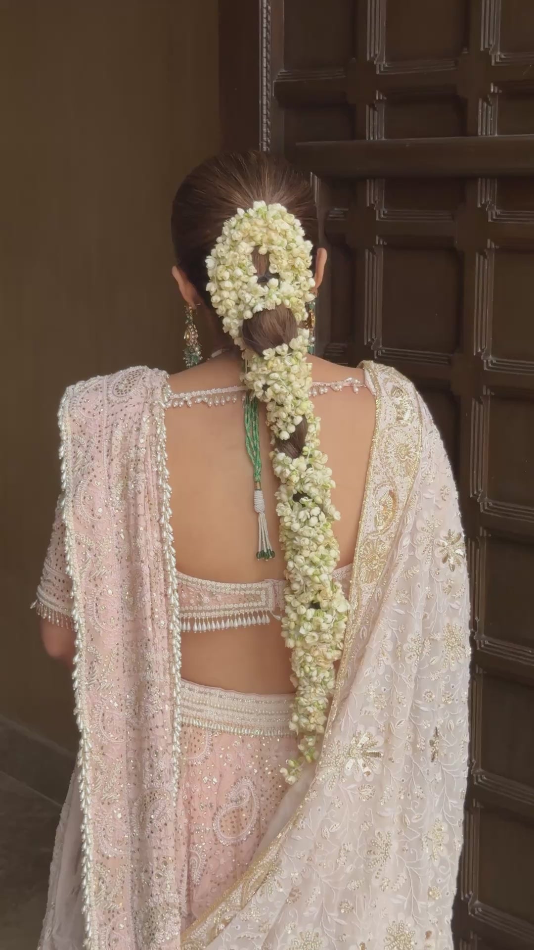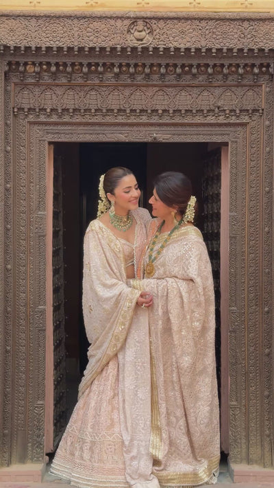 Featuring an ivory pink Mukaish georgette lehenga adorned with intricate chikankari, delicately embellished with Mukaish, pearls, and cutdana work, exuding timeless elegance. Paired with a double dupatta mirroring the same exquisite detailing, and a heavily embroidered Chikankari blouse featuring graceful pearl hangings.