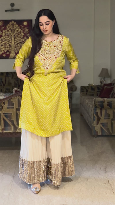 A yellow bandhani kurta and dupatta paired with an ivory hand-crushed sharara. Light, festive, and made for easy celebrations.