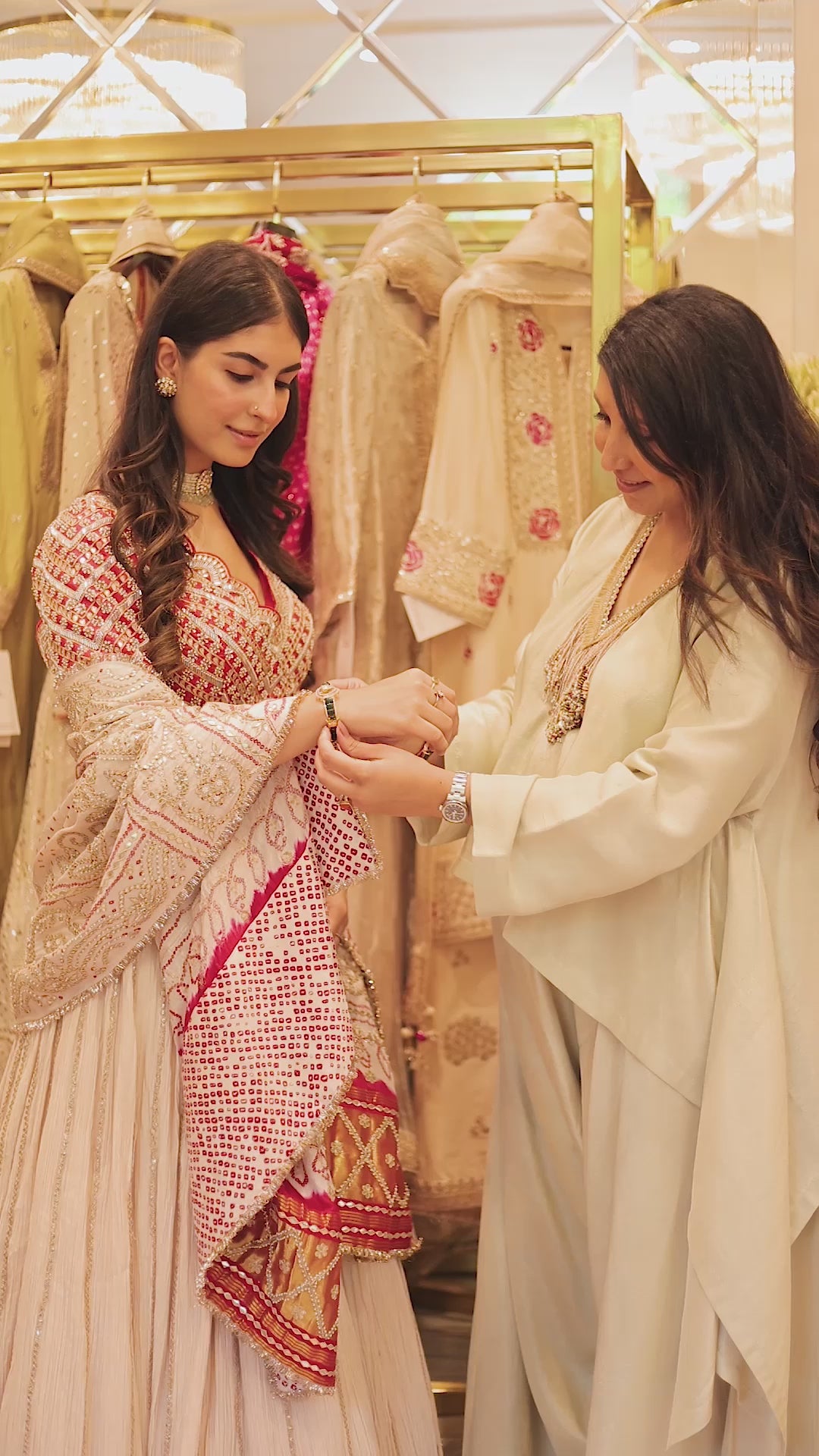 Featuring an off-white lehenga in crushed cotton base with a Matching ivory-red dupatta. It is paired with a contrasting red blouse. Perfect wear for any occasion, from weddings to festive celebrations and cultural gatherings.