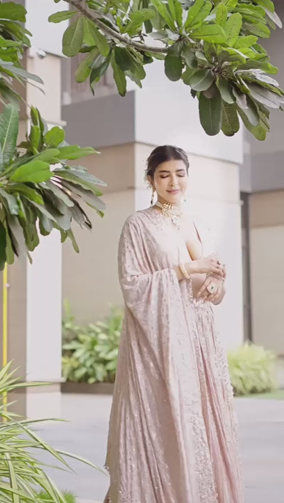 Featuring an elegant onion pink crushed silk lehenga highlighted with delicate rose lari mukaish work, creating a graceful shimmer. It is paired with a mukaish work blouse that adds a statement sparkle to the ensemble. The look is completed with a soft georgette dupatta beautifully highlighted with mukaish and finished with intricate pearl work, enhancing its timeless charm.