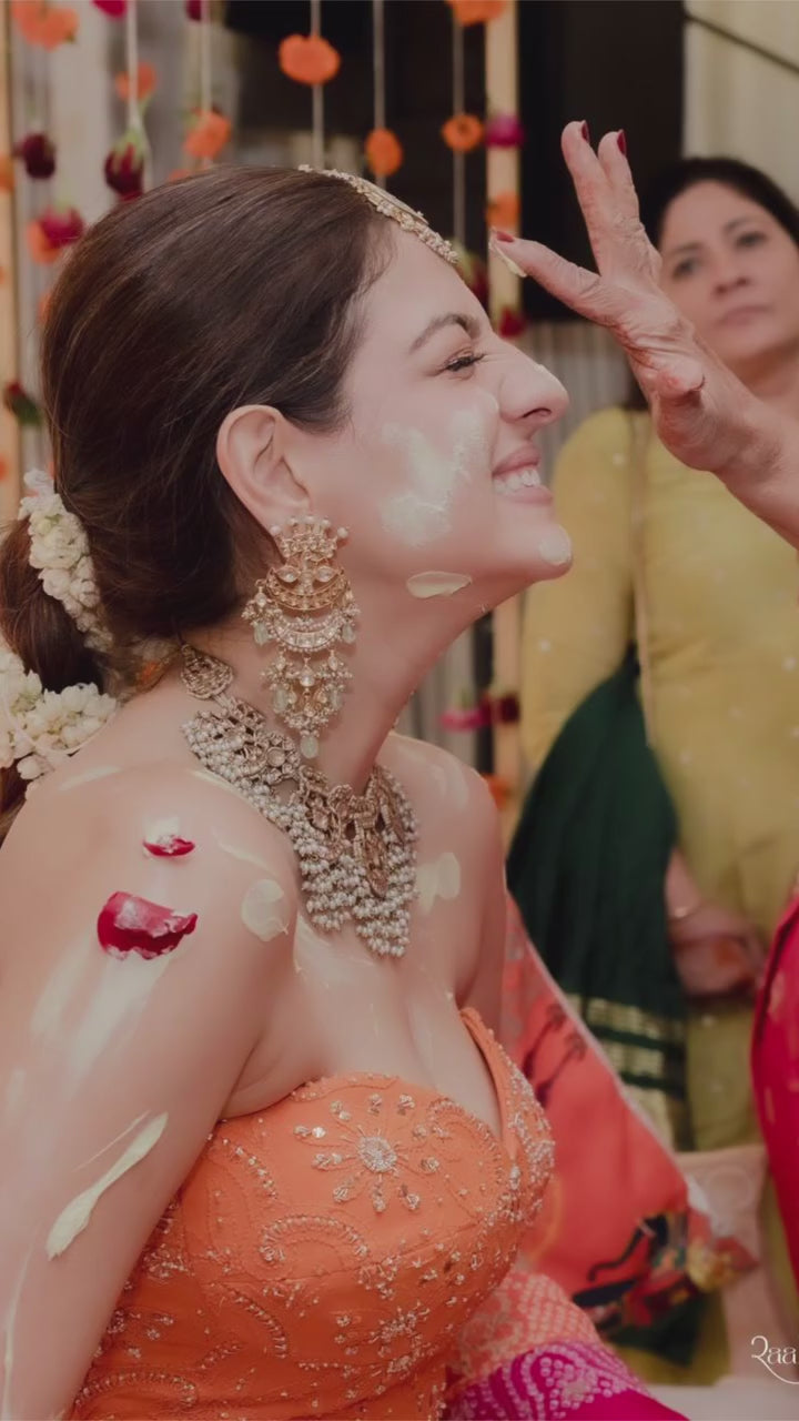 Featuring a vibrant orange gajji silk lehenga adorned with traditional circle bandhani butta work, beautifully enhanced with intricate gota, mukaish, and delicate French knot embroidery. It is paired with an orange coreset exquisite cross-back design, adding a perfect balance of elegance and modern charm with orange-pink contrasting heavy gajji silk bandhani dupatta.