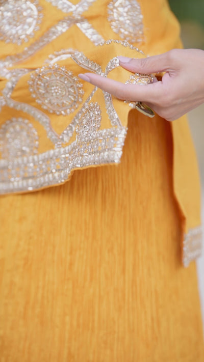 Featuring an orange kurta in dupion silk base. It is paired with sharara pants and an organza dupatta. Accentuate with statement jewellery and heels for weddings or festive ceremonies.