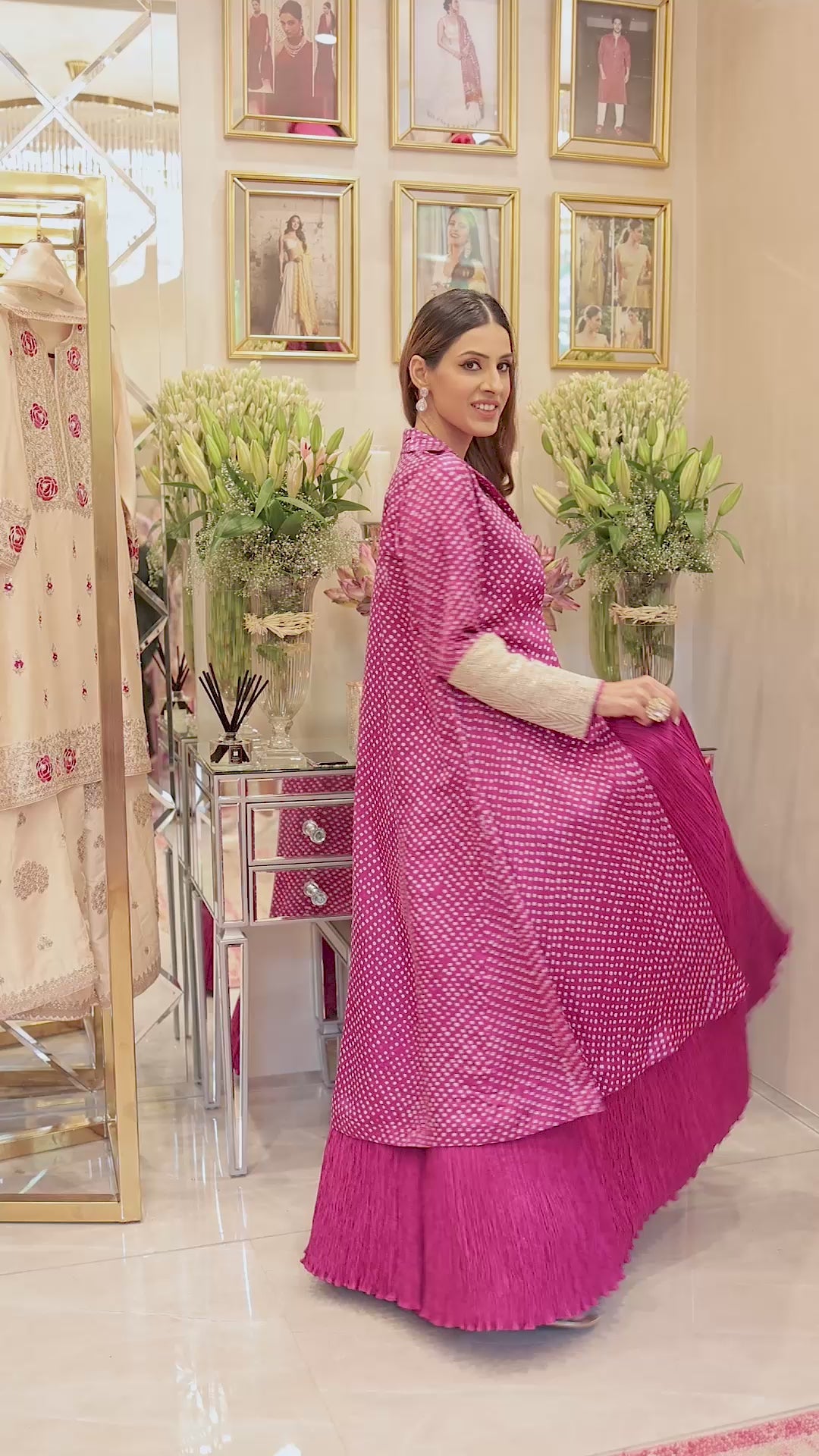 Featuring a pink bandhani jacket in crushed silk base. It is paired with a crushed inner and a detachable belt. Accentuate it with statement jewelry and heels for a festive occasion or sangeet ceremony.
