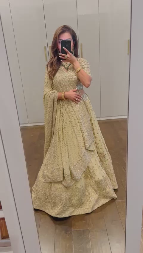 A sage green lehenga richly adorned with intricate embroidery, paired with a matching embellished blouse and dupatta. Regal, detailed, and perfect for weddings and grand occasions.