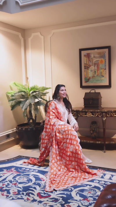 Featuring a white kurta in Dupion silk base. It is paired with pants and a bandhani dupatta. Accentuate it with statement jewellery and heels for a festive occasion or a pooja ceremony.
